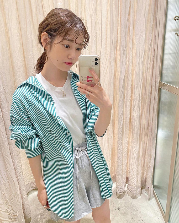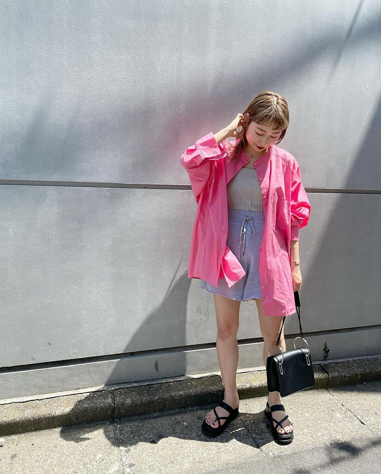 ハーフショーツはレジャーシーンで動きやすいだけでなくヘルシーな女らしさも狙える。キレイ色シャツで華やかさを加えるのが人気。