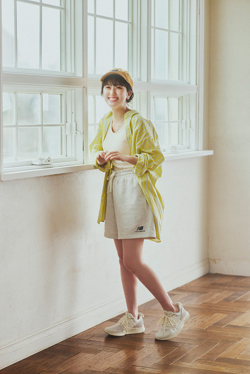 ママになって等身大なファッションがよりいっそう注目を集める、るっこさん(Instagram@rukkoooy)。遊園地や動物園などおでかけ待ち遠しい春、「まだ抱っこしている時間が長いから歩きやすさが大事」と選んだのが、ハッピーな気持ちを高める明るい『UA990』とスウェットのハーフショーツだった。
