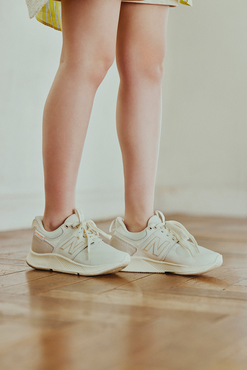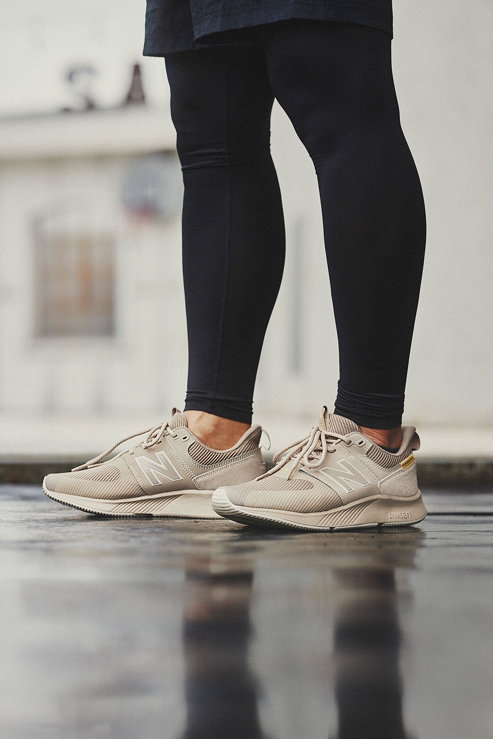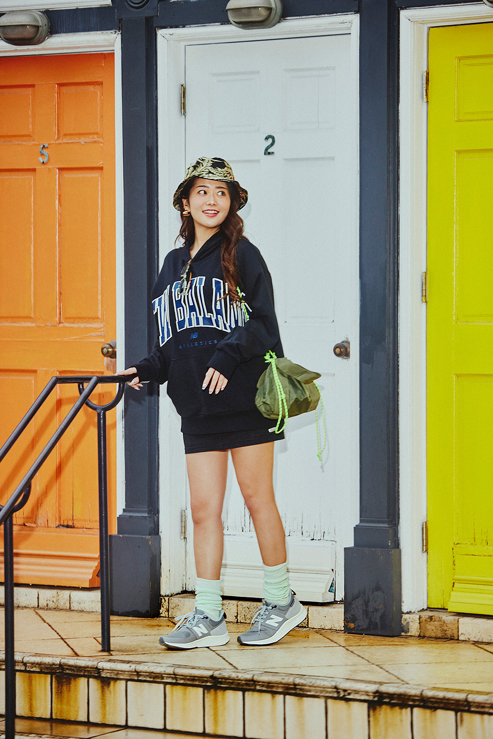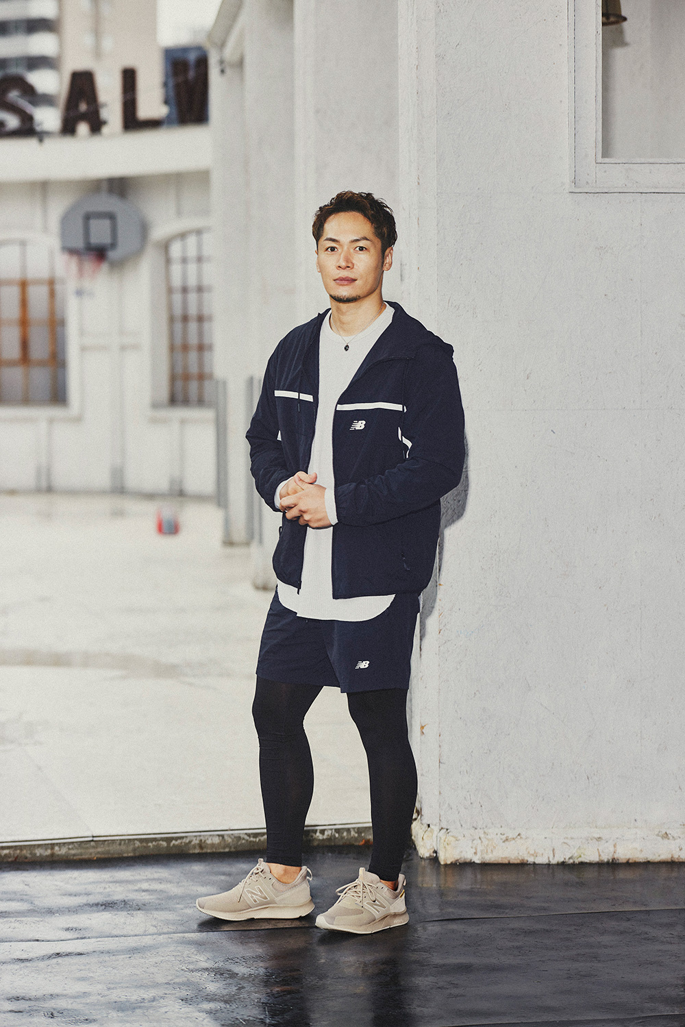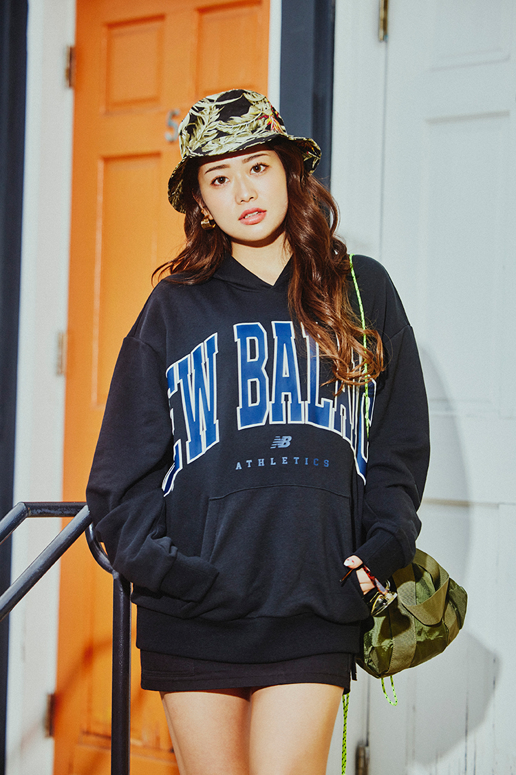 とりあえず動きやすい服、に見えないように派手に盛るのがポイント。黒のタイトミニのワントーンでフーディーのロゴをとことん強調。メッシュ素材のアッパーがスポーティーな『UA990』はビッグNとソールがアクセントになってレジャー気分を盛り上げてくれる。王道のグレーとペールカラーのルーズソックスでギャップのあるユニークな組み合わせに。