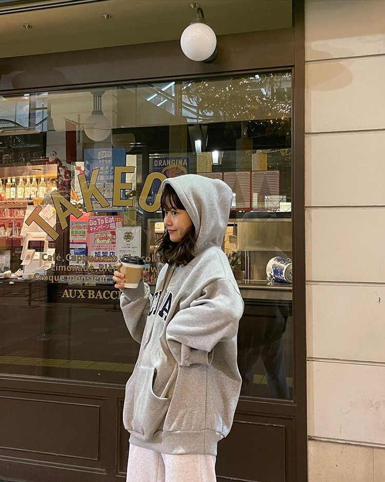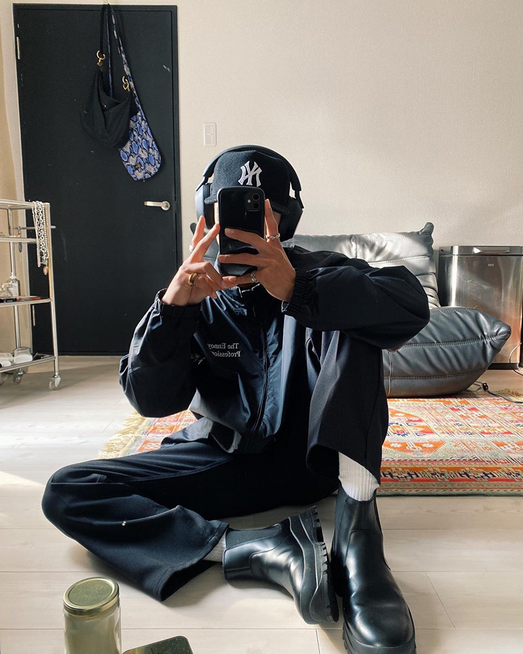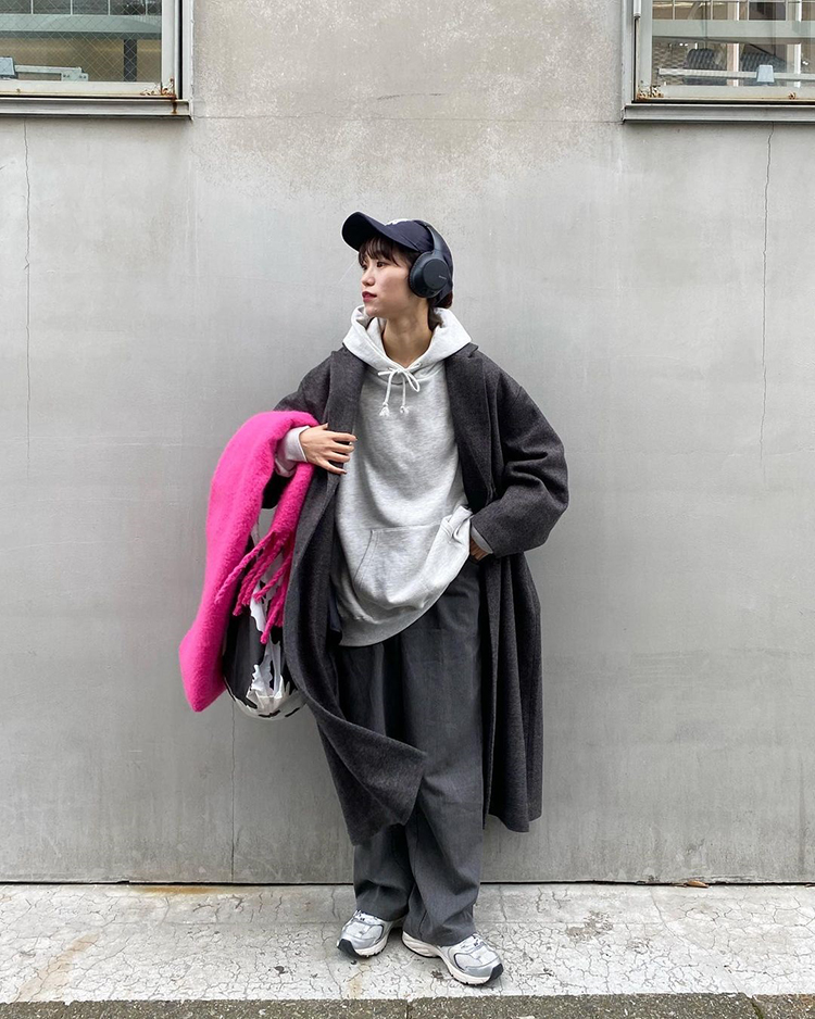 モデルとしても活躍する8467(やしろなな)さんがテーマパークに行く日はロゴどんフーディーで写真映えを意識。足元は海外スナップみたいなストリート感が今どきな『UA990』のグレーをピックアップ。ベーシックなカジュアルでは満足せずに、バケハやルーズソックスで盛る遊び心がやしろさんらしい。