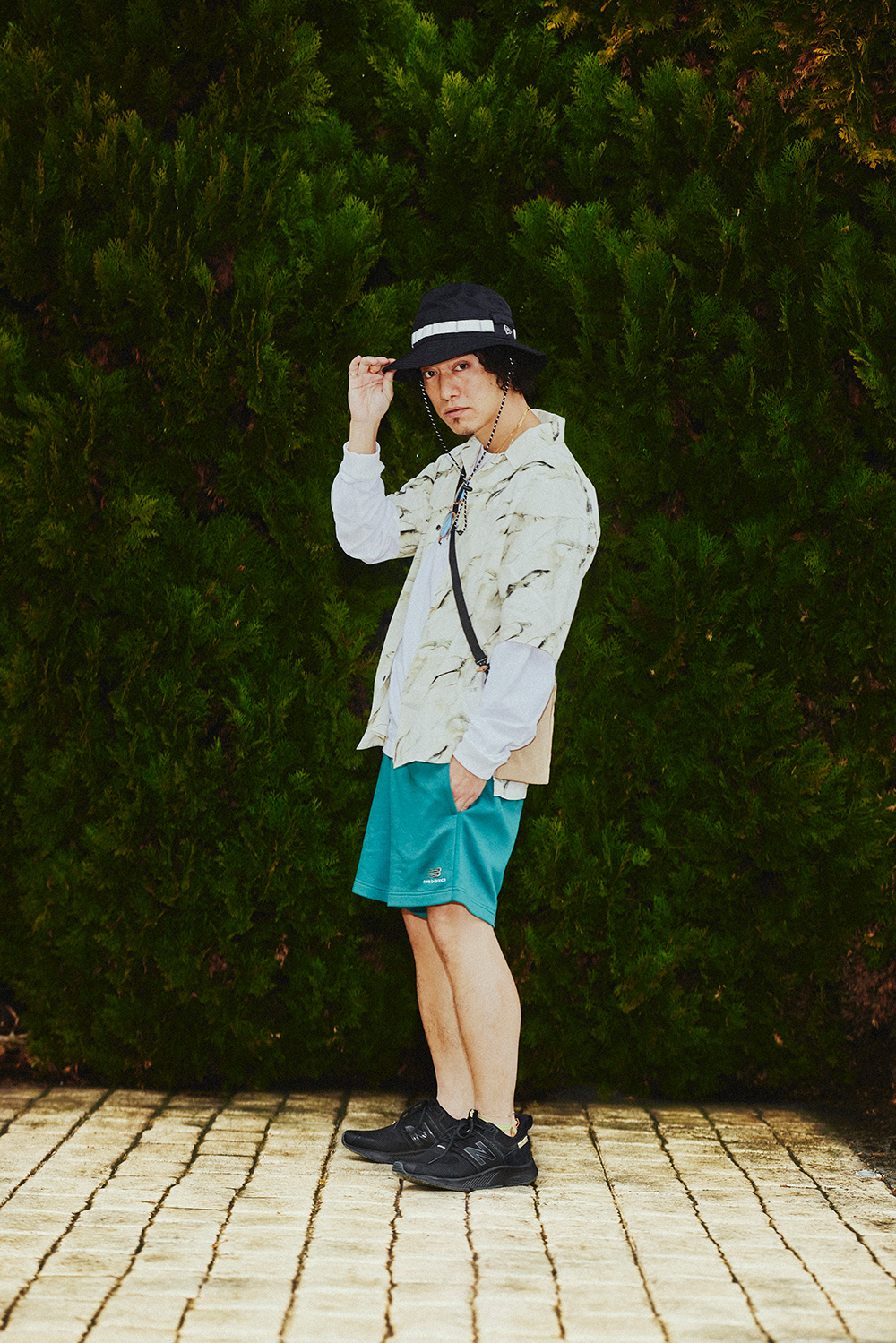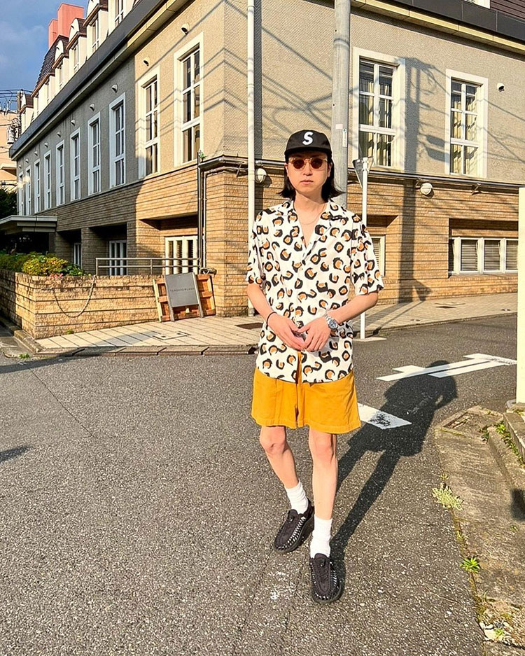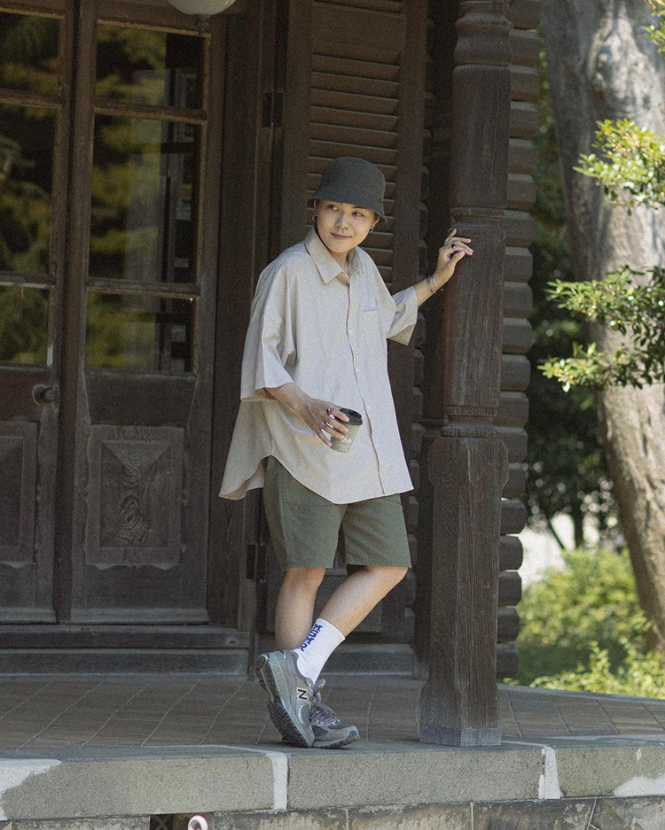 KIKUMARUさんがフェスの相棒に選んだのはニューバランスらしいオーセンティックなデザインを受け継ぎつつ、よりスポーティーで機能的な『UA990』。そして古着のような風合いが心地いいスウェットハーフショーツ。動きやすさを意識してもワンツーコーデでは終わらせない。ハーフスリーブのシャツとロンTのレイヤードの狙いすぎないおしゃれ感がさすが。