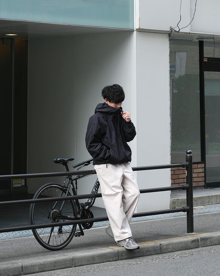 アイコニックな『78ジャケット』を90年代テイストにアレンジしたウインドブレーカーとウインドパンツ、散歩中のウェアからも今の気分を切り取る感度の高さが伝わってくる。スポーティーな印象を裏切るのが足元のベージュ。シューレースまでニュアンスカラーで統一され洒落た雰囲気に。安易に白黒でまとめないハズしがスタイリッシュさに磨きをかける。