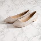 丸みのあるポインテッドトゥにエッジの効いたメタリックのヒールを合わせたローヒールパンプス。