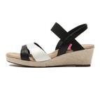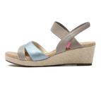 夏らしいラメ素材とメタリックのパイピングをアクセントにした少しリッチなカジュアルサンダル。[\n]足裏を包み込むフカフカのお椀形状のフットベッドが絶妙なフィット感を与えます。[\n]フカフカのクッションで足当たりが良いのは勿論、屈曲性の良いウエッジソールでストレスフリーな履き心地を実現しています。