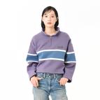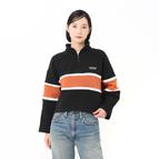 身頃と袖に配色切替デザインの入った衿付きハーフZIPスウェット。