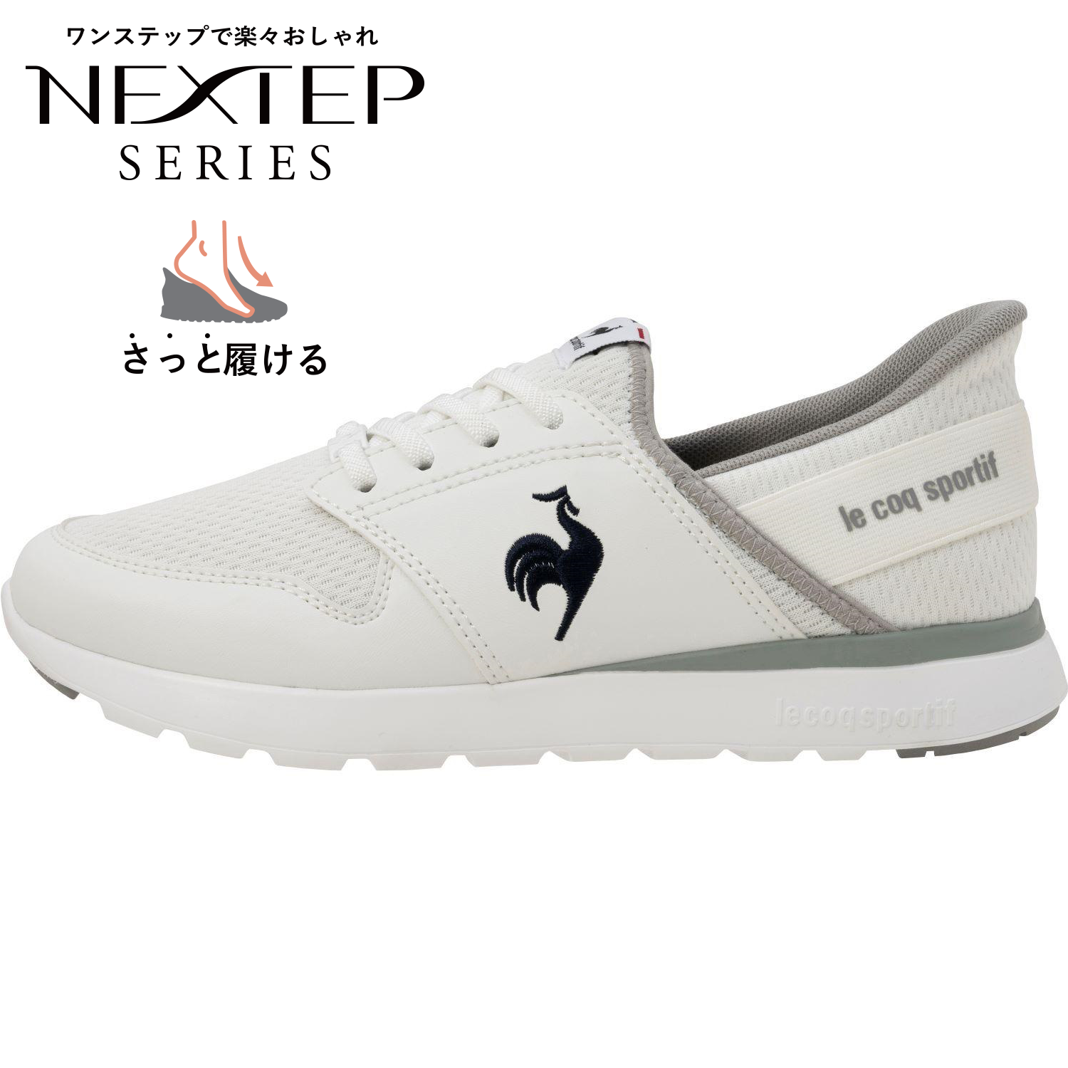 さっと履ける足入れしやすい履き口の形状にこだわりました。また、スムースに足を入れることができるよう、ストレッチ性のある履き口周りの仕様に。急いでいる日もすぐに履いて出れるモデルです。屈曲性とクッション性のある軽量アウトソールを採用し、快適な足入れ感を実現しました。インソールには通気性のある高反発材と低反発材を組み合わせたミックスクッションインソールを採用。
