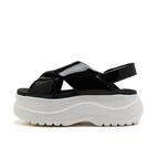 ボリュームのある厚底ソールとクロスベルトがエレガントなデザインで、幅広いコーディネートに取り入れられる一足。