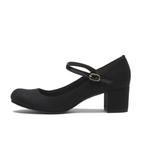 ゆったりとしたラウンドトゥのパンプスは、5cmのブロックヒールで安定感があり、甲をしっかり抑えるベルトデザインで女性らしさを叶えながらも歩きやすいです。