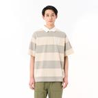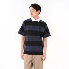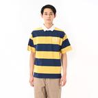 コットンx ポリエステル天竺の先染めボーダー柄半袖ラグビーシャツ。