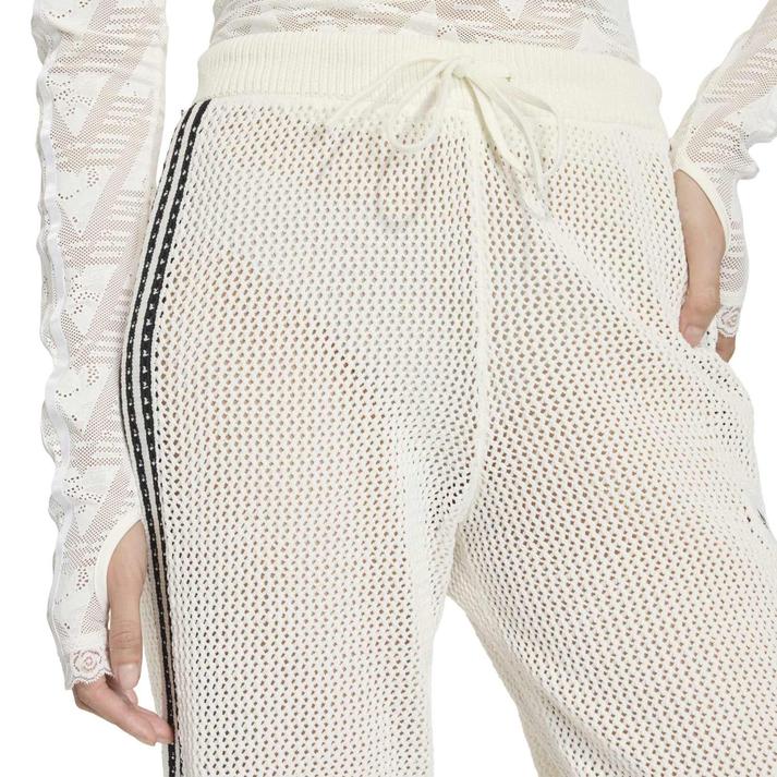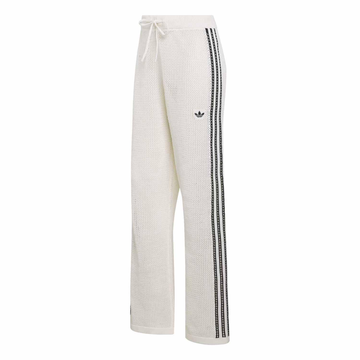 このトラックパンツは、クラシックなスポーツスタイルとモダンなかぎ針編みのデザインをシームレスに融合させ、人気のシルエットに独特のひねりを加えている。