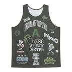 design:40年代のアメリカで、学校の卒業記念としてパンツに寄せ書きをしていた文化「メモリアルパンツ」をモチーフに、AKTRの今までのグラフィクを用いてデザインしたシリーズのタンクトップ。