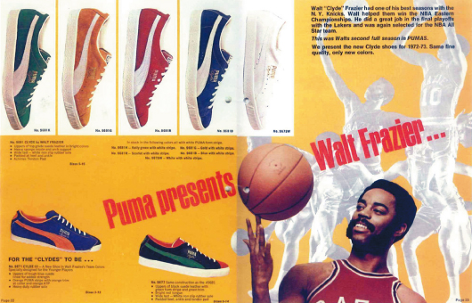当時、ニューヨークで活躍をしていたプロバスケットボール選手、ウォルト・”クライド”・フレイジャーが、シグネチャーモデル PUMA CLYDEをリリース。1979年まで約6年間、少しずつアップデートを重ねながら販売される。このモデルが後にPUMA SUEDEへと繋がってゆく。