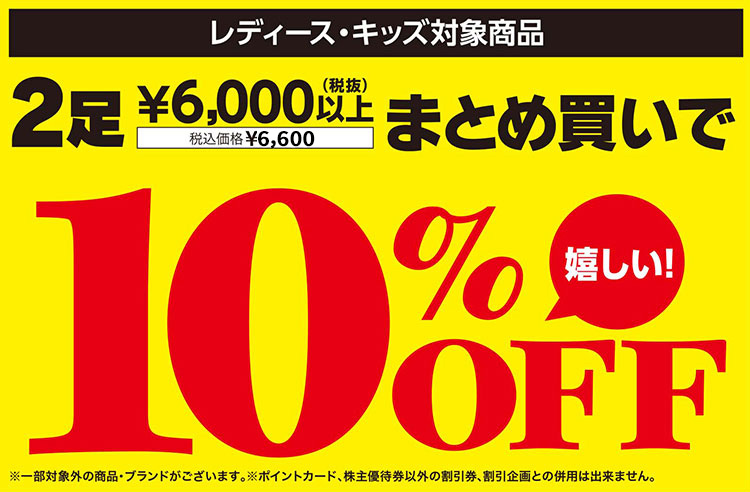 続いてレディース、キッズ対象商品おまとめ買い¥6,000(税抜き)以上で10%OFF!!