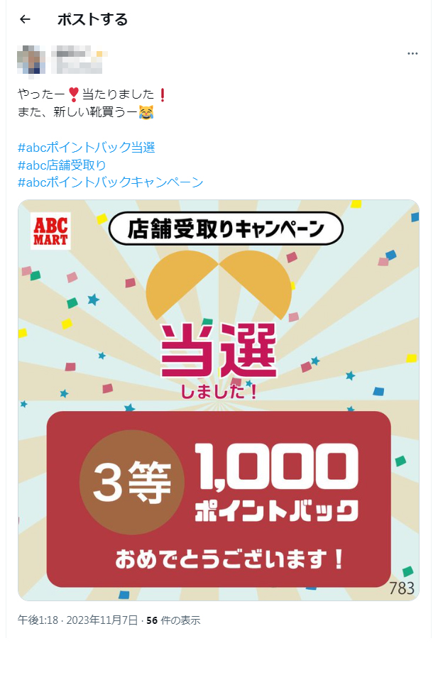 【X(旧:Twitter)】の場合は、当選画像、「@ABCMART_INFO」をメンション、ハッシュタグ「#abcポイントバック当選 #abc店舗受取り #abcポイントバックキャンペーン」3つすべてを付けて投稿してください。