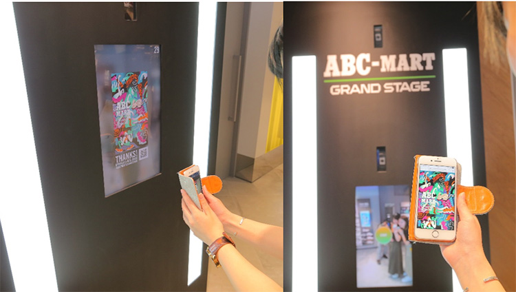 「Kick Picks」では、タッチパネルで「GRAND STAGE」限定の背景、各ブランドや「GRAND STAGE」ロゴのフレーム・バッジを選択し、見下ろし/正面/足元の3箇所に設置されたカメラで撮影した画像をGIFアニメーション化、QRコードにてその場でデータを取得できます。