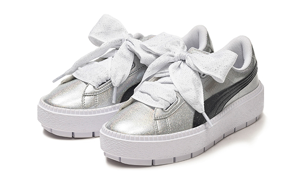 厚底の流行がまだまだ続く中、プーマのプラットフォーム ウィメンズは数ある厚底の中でも安定の人気を誇っています。今回は記念すべき40周年のコラボシューズとしてレディースのトレンドの凝縮された一足にするため、プーマとABC-MARTの別注モデルPLATFORM HEART GLITTERの作成に至りました。