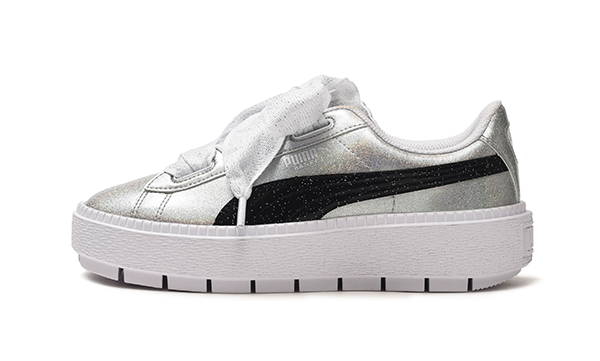 90年代のグランジファッションの象徴的なプラットフォームを現代風にアレンジ。今回40周年限定モデルについては、ラグジュアリーでアイキャッチなステッチとグリッターの入ったプーマフォームストリップ、トレンドの太リボンシューレース、モダンなディテールとシルバーグリッターの華やかさで今年の流行を凝縮した一足に仕上がっています。