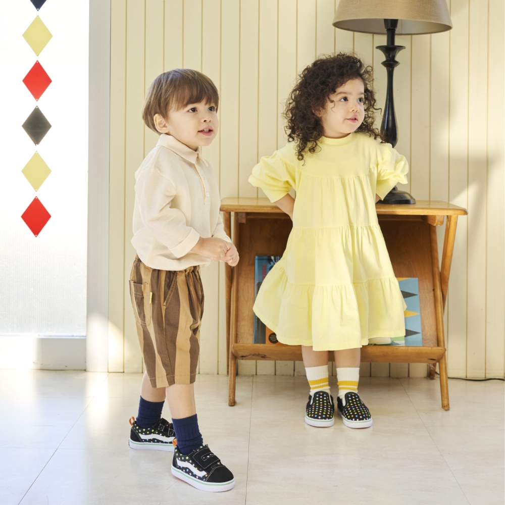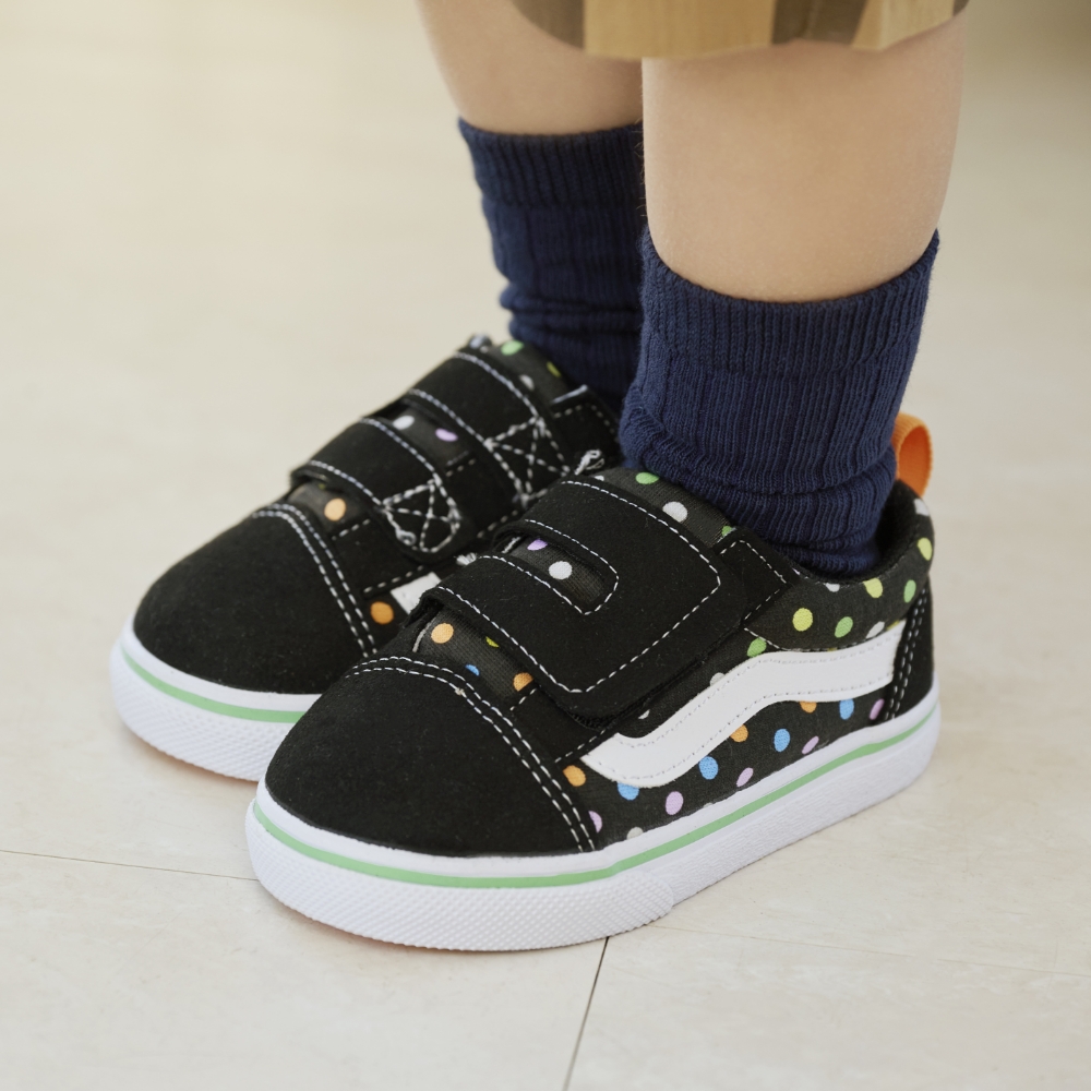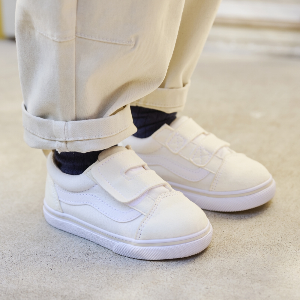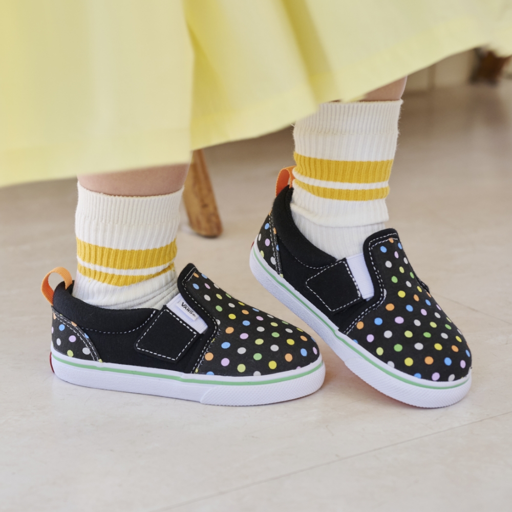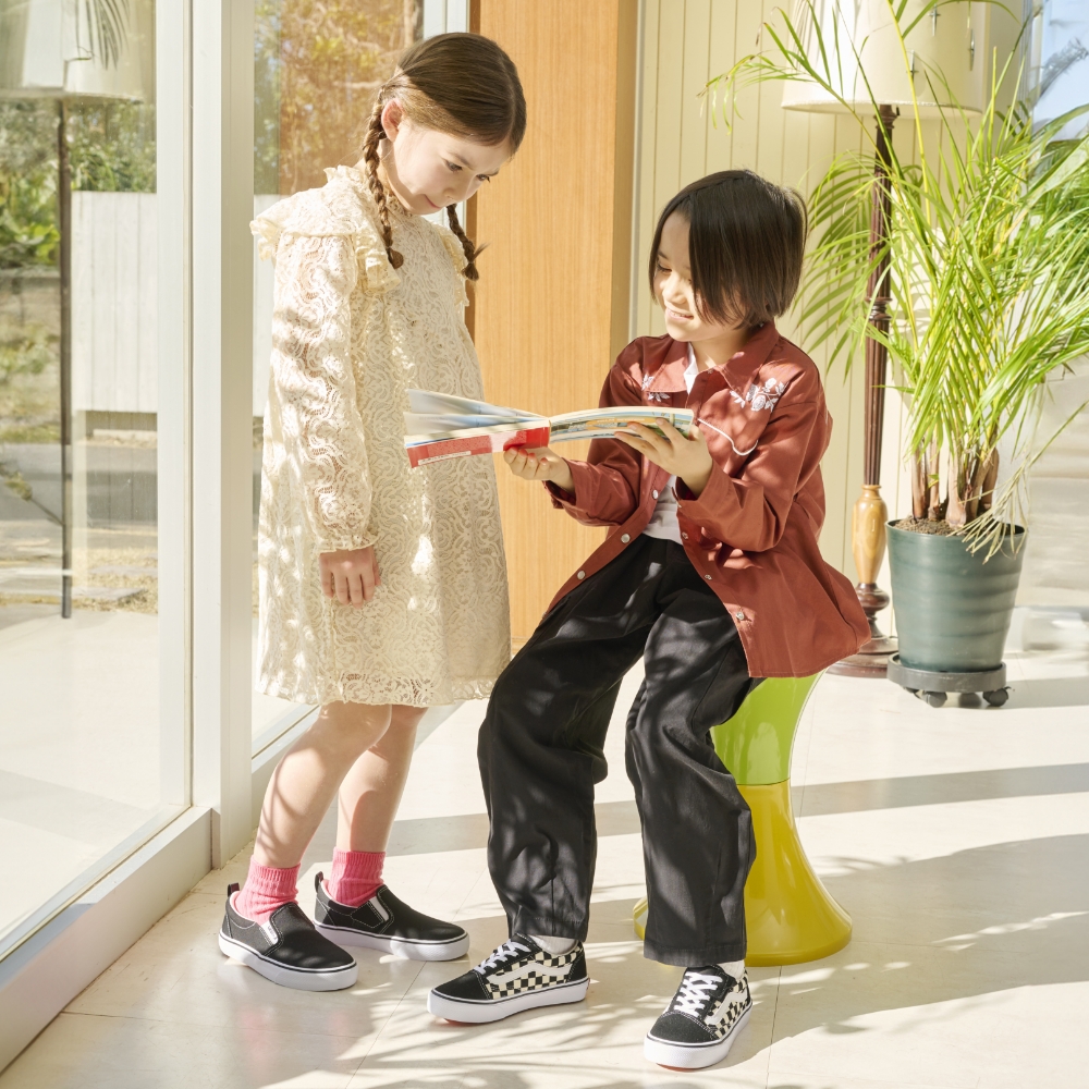 脱ぎ履きがしやすいよう、履き口にベルトストラップを使用。 柔らかいソールやゴム製のシューレースなど、VANSのいつものシルエットはそのままに、 キッズに優しい機能を多数搭載。
