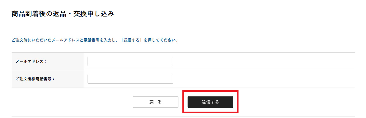 ご注文時にいただいたメールアドレスと電話番号を入力し、「送信する」を押してください。