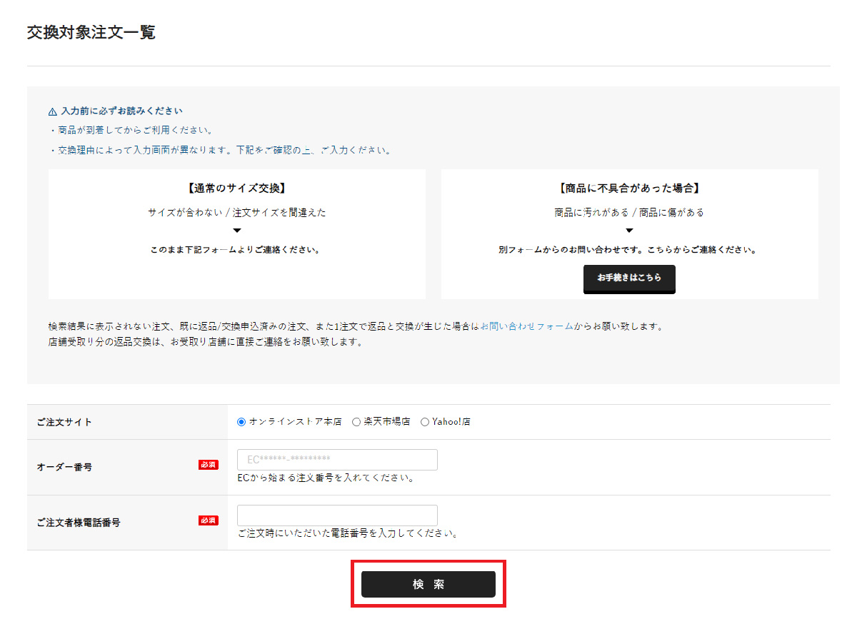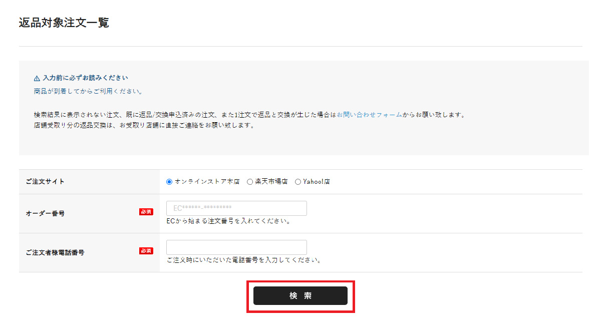 ご注文サイト・オーダー番号・ご注文時の電話番号を入力し検索