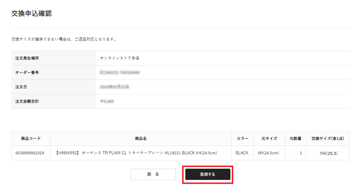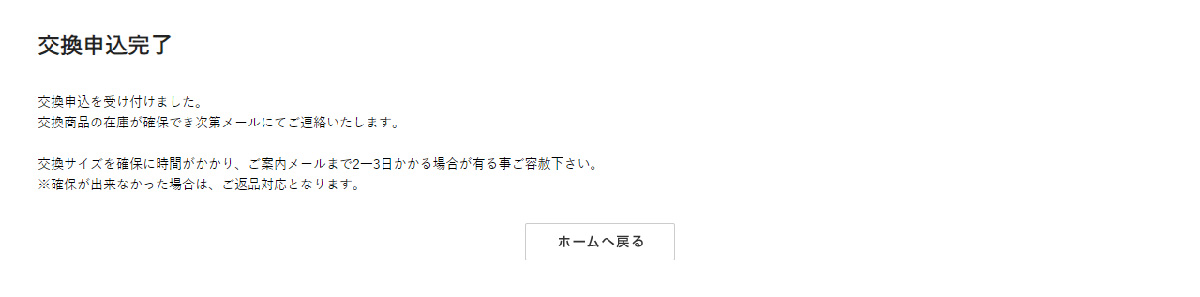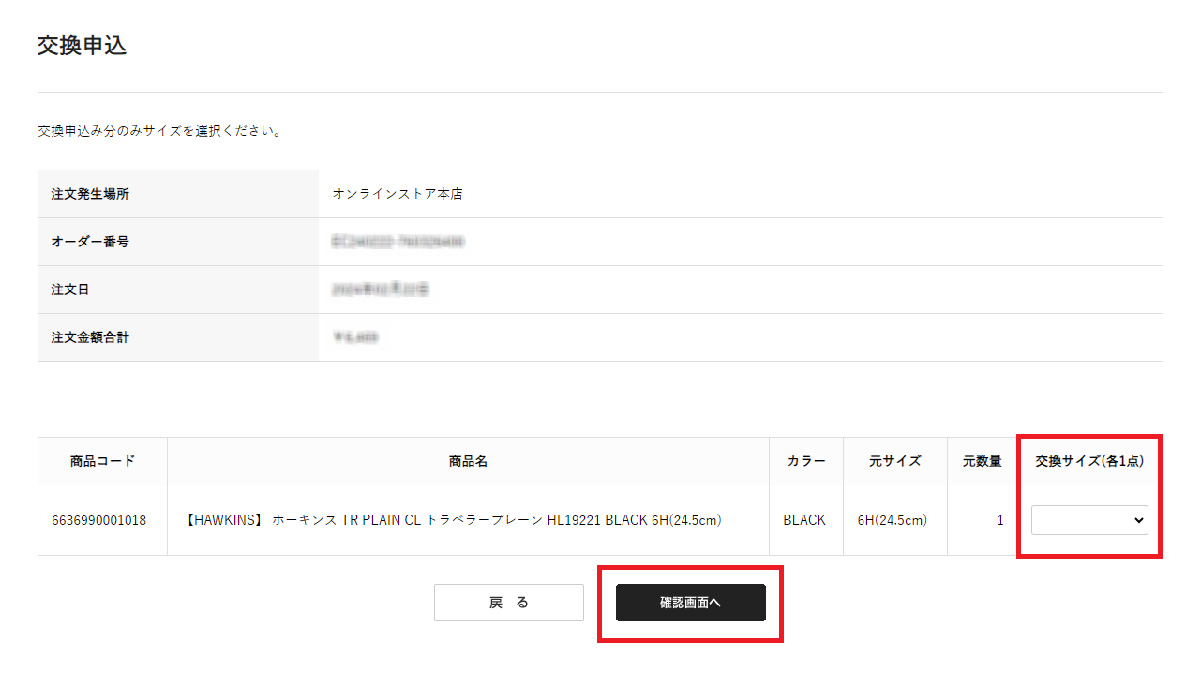 交換希望サイズを選択し確認画面へ