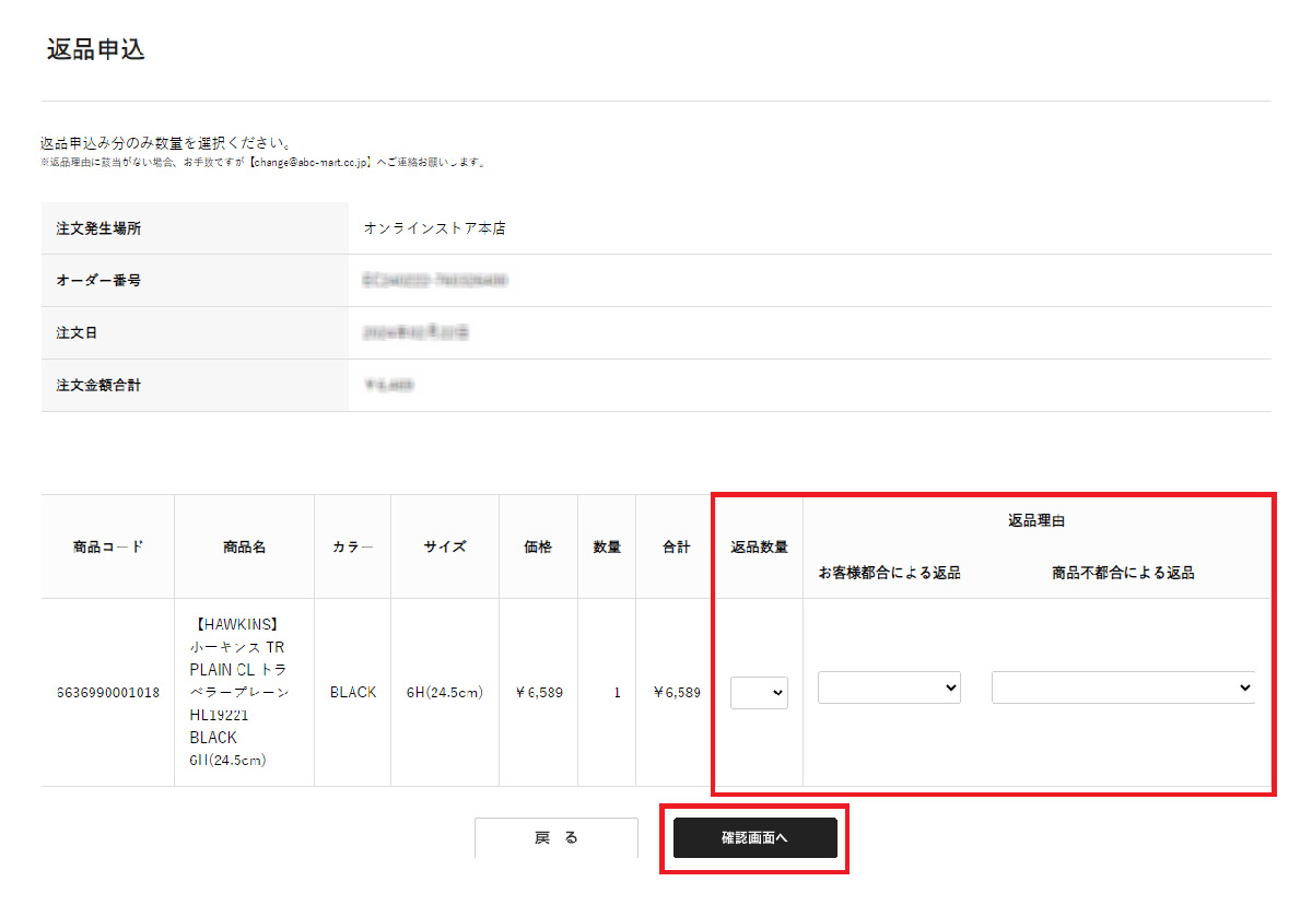 返品数量・返品理由を選択し、確認画面へ